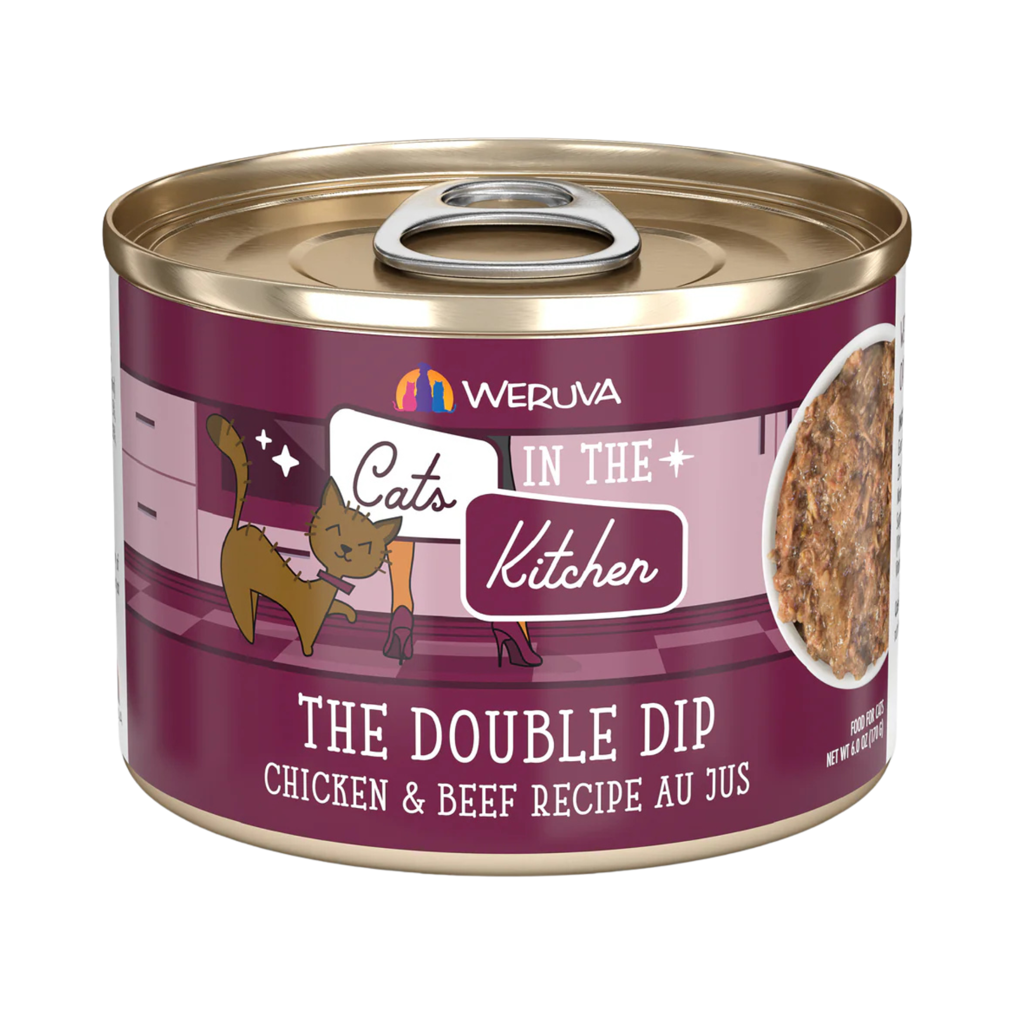 Weruva Cats In The Kitchen The Double Dip Chicken & Beef Cat Canned offers a delicious and nutritious meal for your cat. This premium canned food is made with cage-free chicken breast and grass-fed beef in a succulent broth au jus. Added fish oil provides essential omega-3 fatty acids, while the recipe is free of grain, gluten, starch, and carrageenan. Your cats will enjoy a high-quality meal that's made from the best ingredients.