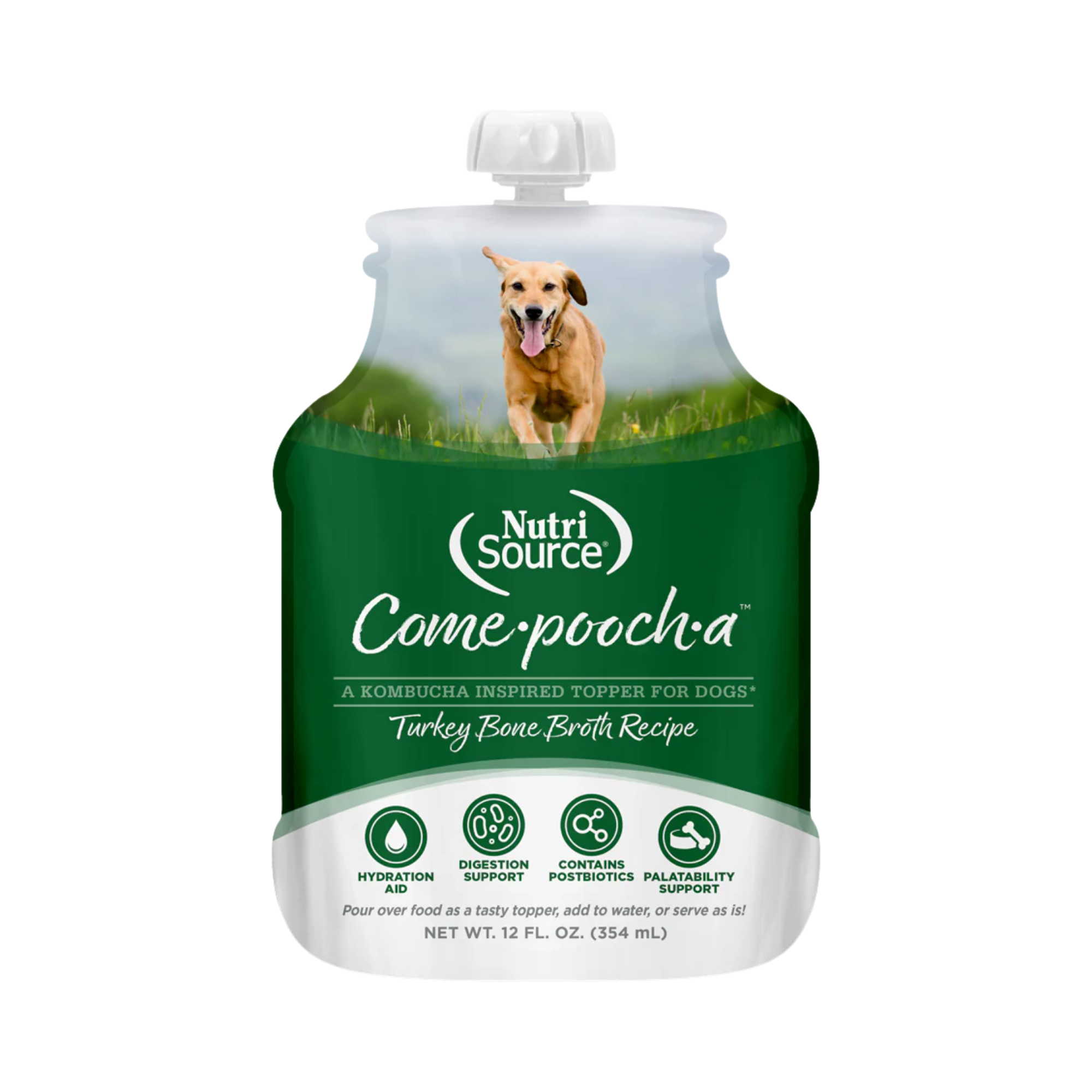 Nutrisource Come-Pooch-A Turkey Bone Broth Topper is the perfect choice for picky eaters, dogs that need a change of pace, or those with decreased appetites due to health issues. It's a nutritious and tasty treat made with postbiotics to help promote digestive health. Whenever your pup needs a flavorful pick-me-up, Come-pooch-a has you covered.