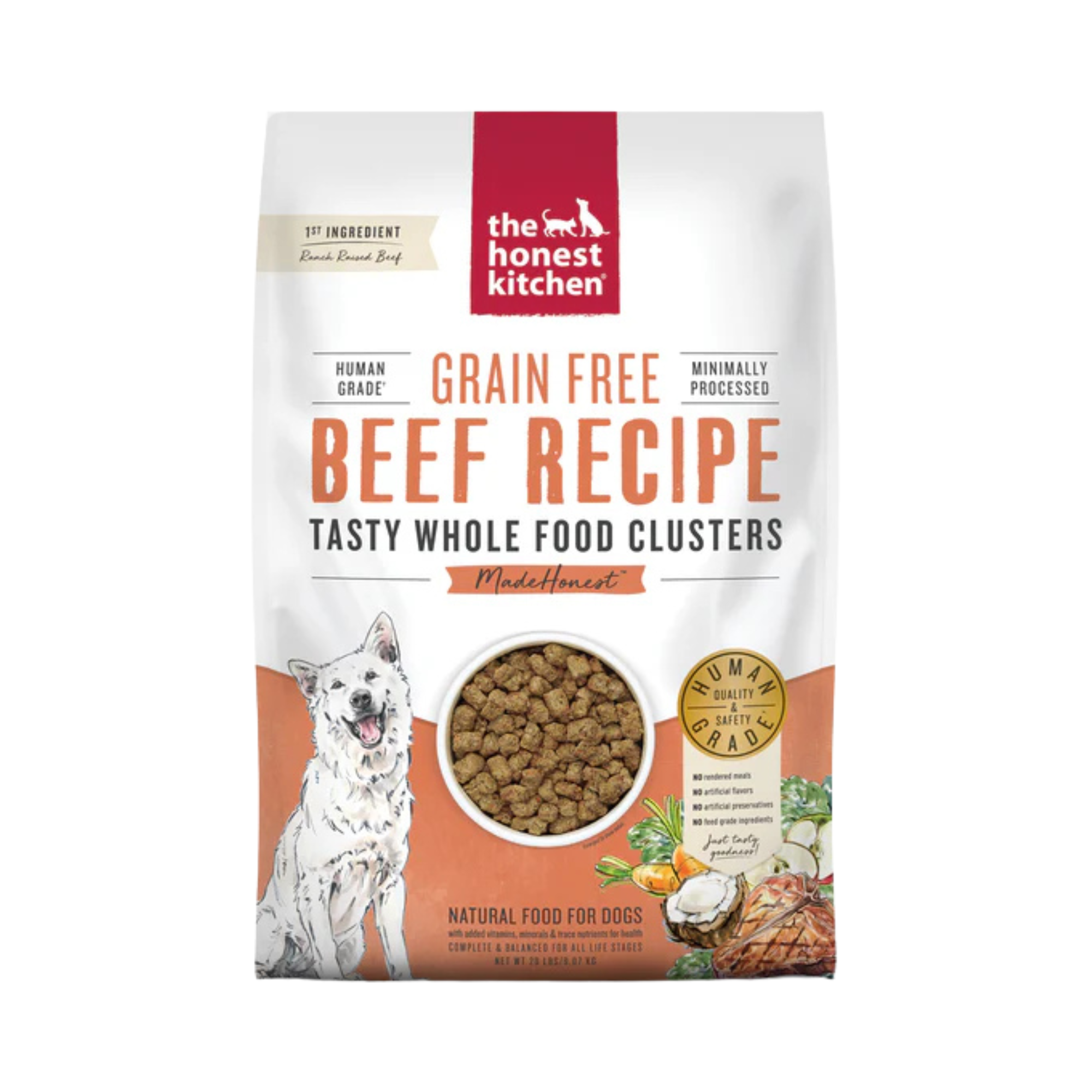 We believe that human grade, minimally processed whole foods provide pets the best nutrition possible. Created with a veterinary nutritionist, these 100% human grade clusters are made with real whole foods you’d recognize from your own kitchen, like ranch raised beef. They’re MadeHonest™ with human grade, nutrient-rich ingredients, cold-pressed into bite sized clusters, roasted and dehydrated to maintain the nutrients, aroma and taste of whole foods. Our Grain Free Beef Whole Food Clusters give you the same scoop & serve convenience as other dry dog foods, while giving your pup minimally processed, 100% human grade taste and nutrition.