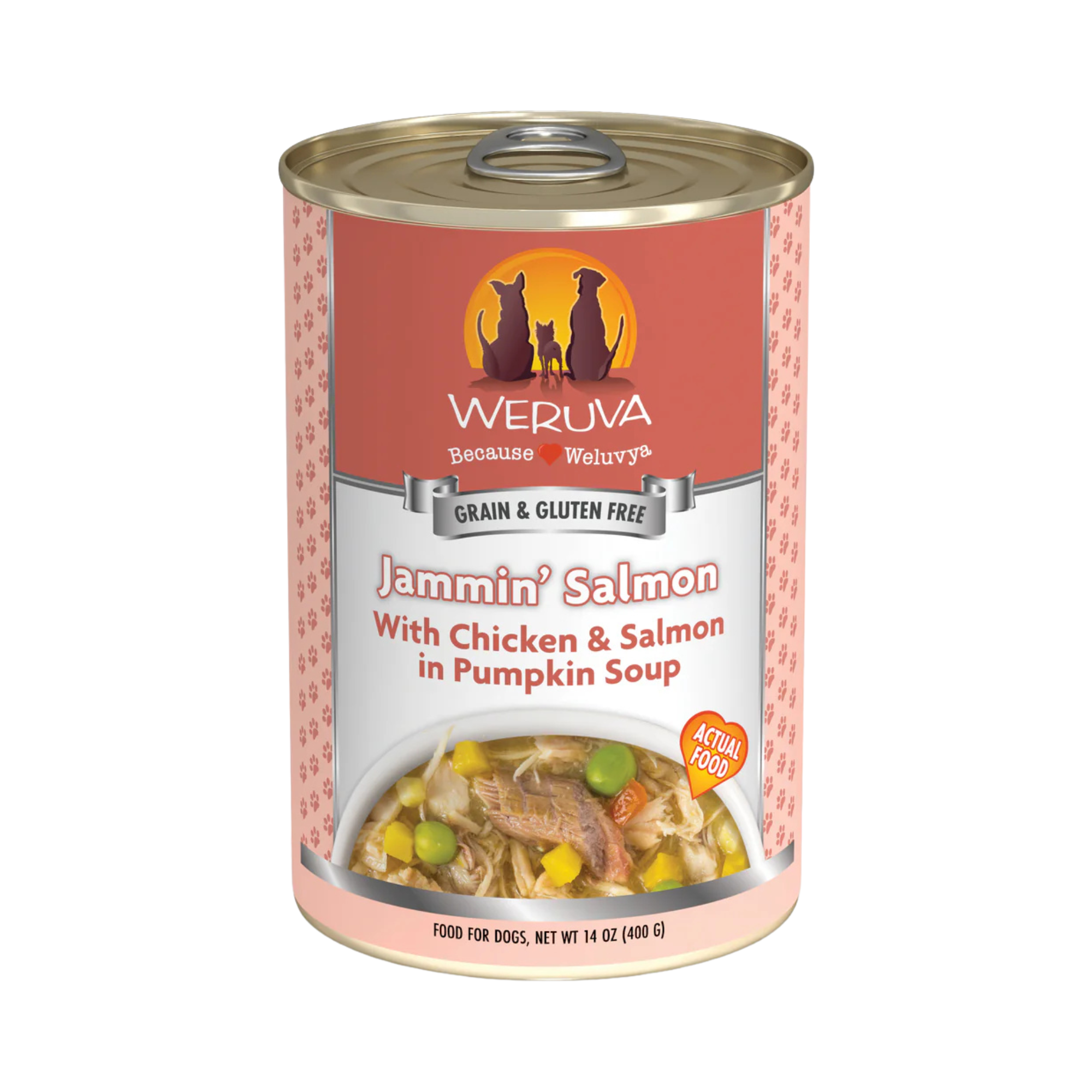 Treat your pup to some Jammin' Salmon with Weruva's Dog Canned formula! This high-protein meal is made with cage-free chicken and wild-caught salmon in a delicious pumpkin soup. Plus, it's free of hormones, antibiotics, grains, gluten, and carrageenan for a tasty and healthy meal! Woof!