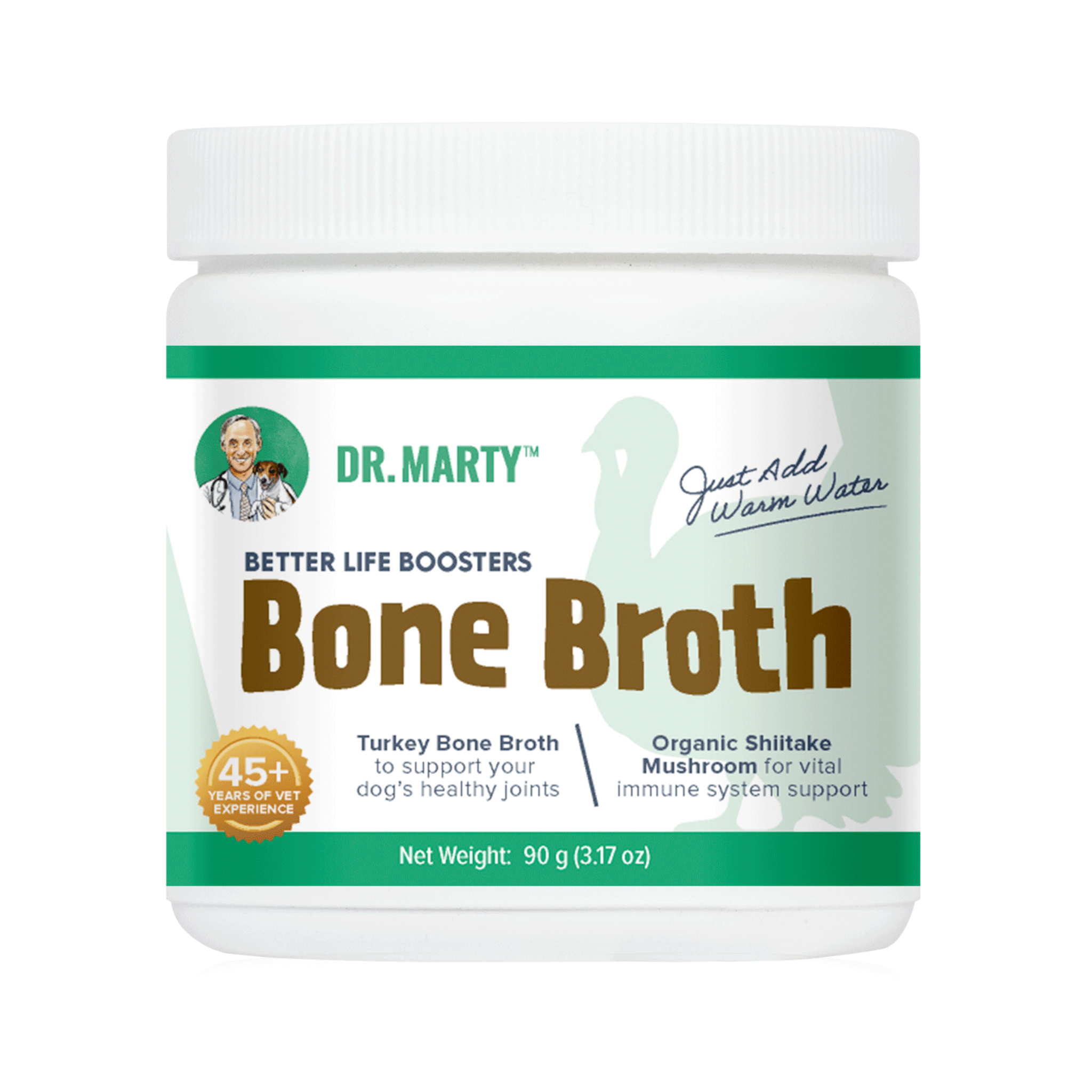 Dr. Marty's Better Life Booster Bone Broth is a powdered formula made with collagen-rich turkey bone broth and shiitake mushroom to support your dog's overall health. With up to 90% of the protein content coming from collagen, it provides powerful joint, skin, gut, and immune system support, all while satisfying their taste buds with a delicious, savory flavor.