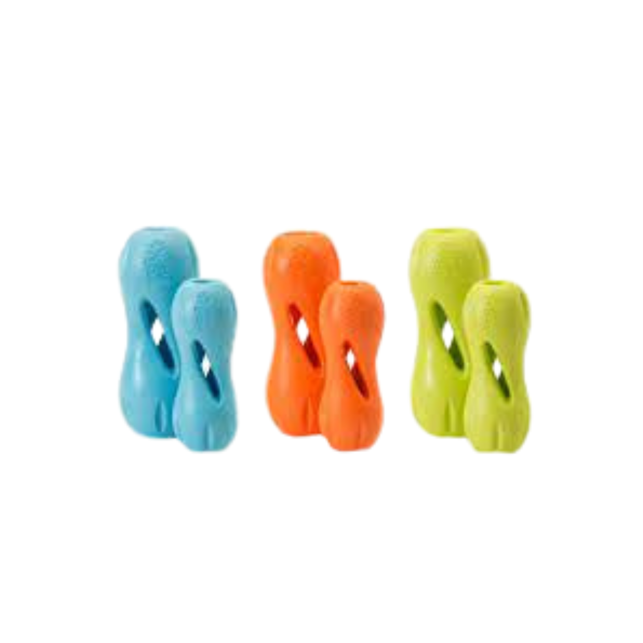 Qwizl is a super tough treat toy that's brilliantly designed to extend the life of expensive dog treats while keeping dogs busy. Side openings release scent and taste while the continuous interior hole allows treats to extend out. Flexible ridges grip multiple sizes of treats.