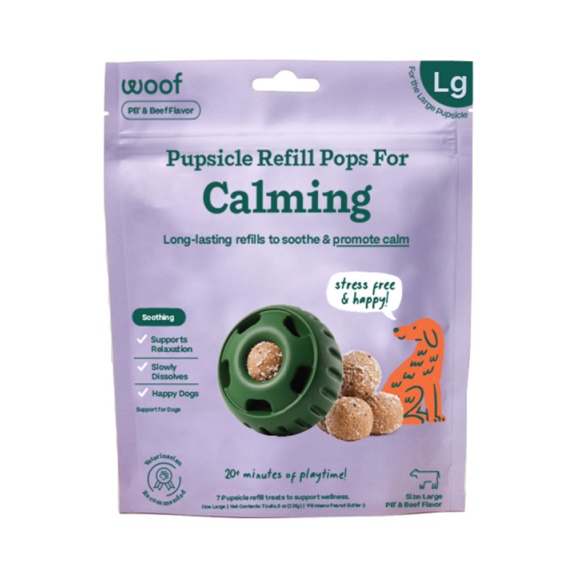 Calming Pops provide 30+ minutes of enrichment, with the added benefit of calming ingredients like passion flower, tryptophan, and magnesium to help cope with stress from thunderstorms, fireworks, and travel days.