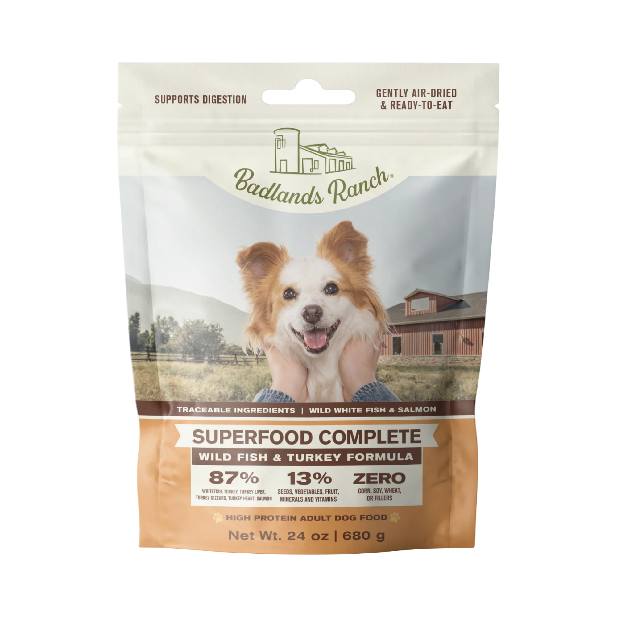 Superfood Complete Wild Fish & Turkey Formula is packed with some of the most wholesome and beneficial foods on Earth, featuring premium whitefish and turkey, nutrient-dense organs, heart-healthy salmon, and a variety of gut-healthy vegetables and fruits. This premium blend delivers all of the nutrients your dog needs to enjoy smooth digestion and overall wellness. These carefully selected ingredients are cooked responsibly at low temperatures to deliver maximum nutrition with every bite. Superfood Complete contains no corn, soy, wheat, or fillers — it’s all the good stuff your dog needs to thrive, with none of the bad.*
