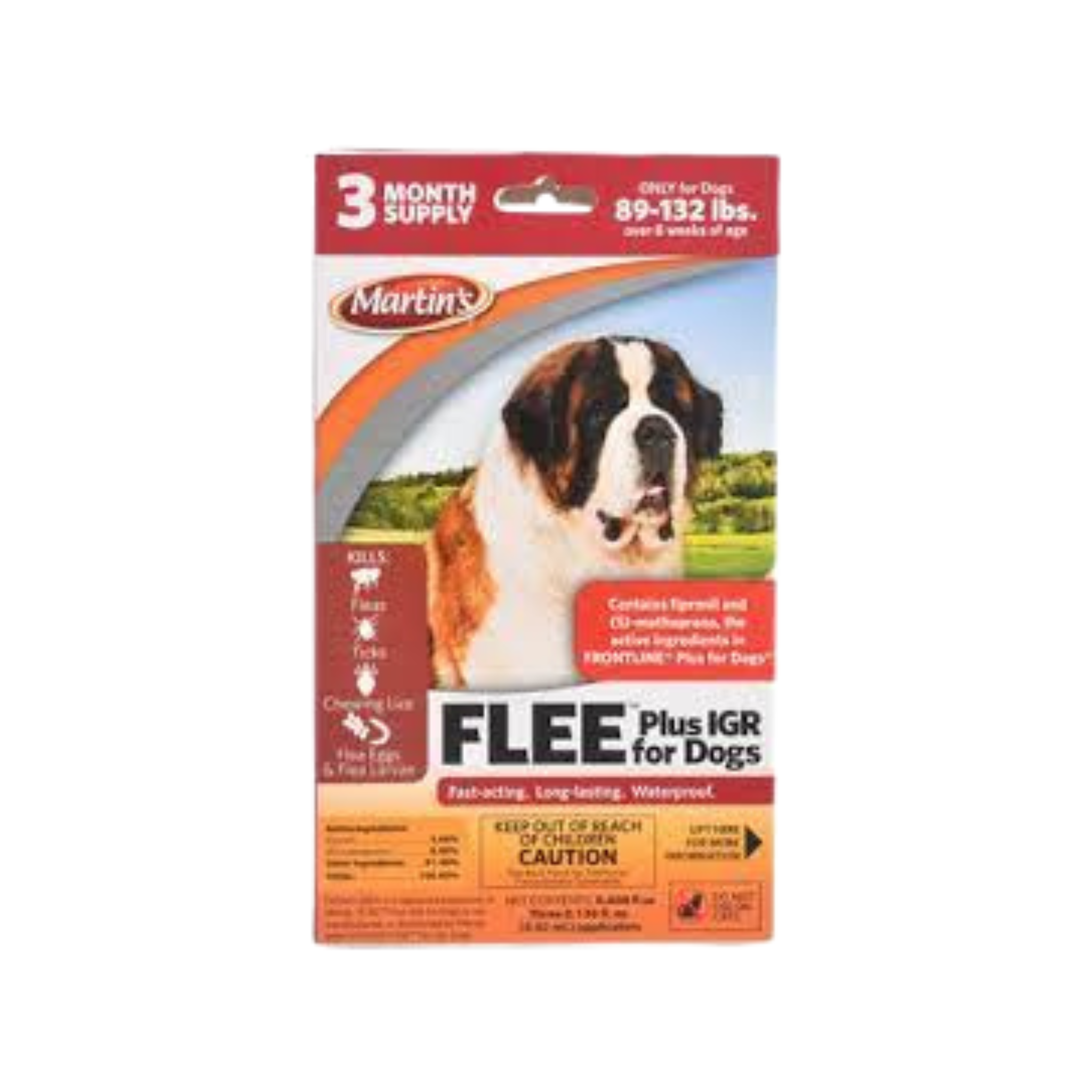 Martin's Flee Plus IGR for Dogs contains fipronil and (S)-methoprene (insect growth regulator) to effectively kill fleas and ticks (including those that may transmit Lyme disease). The active ingredients in FLEE Plus IGR for Dogs feature a sustained release formula developed for fast-acting and long-lasting control of fleas, ticks, and chewing lice for up to one month on dogs.