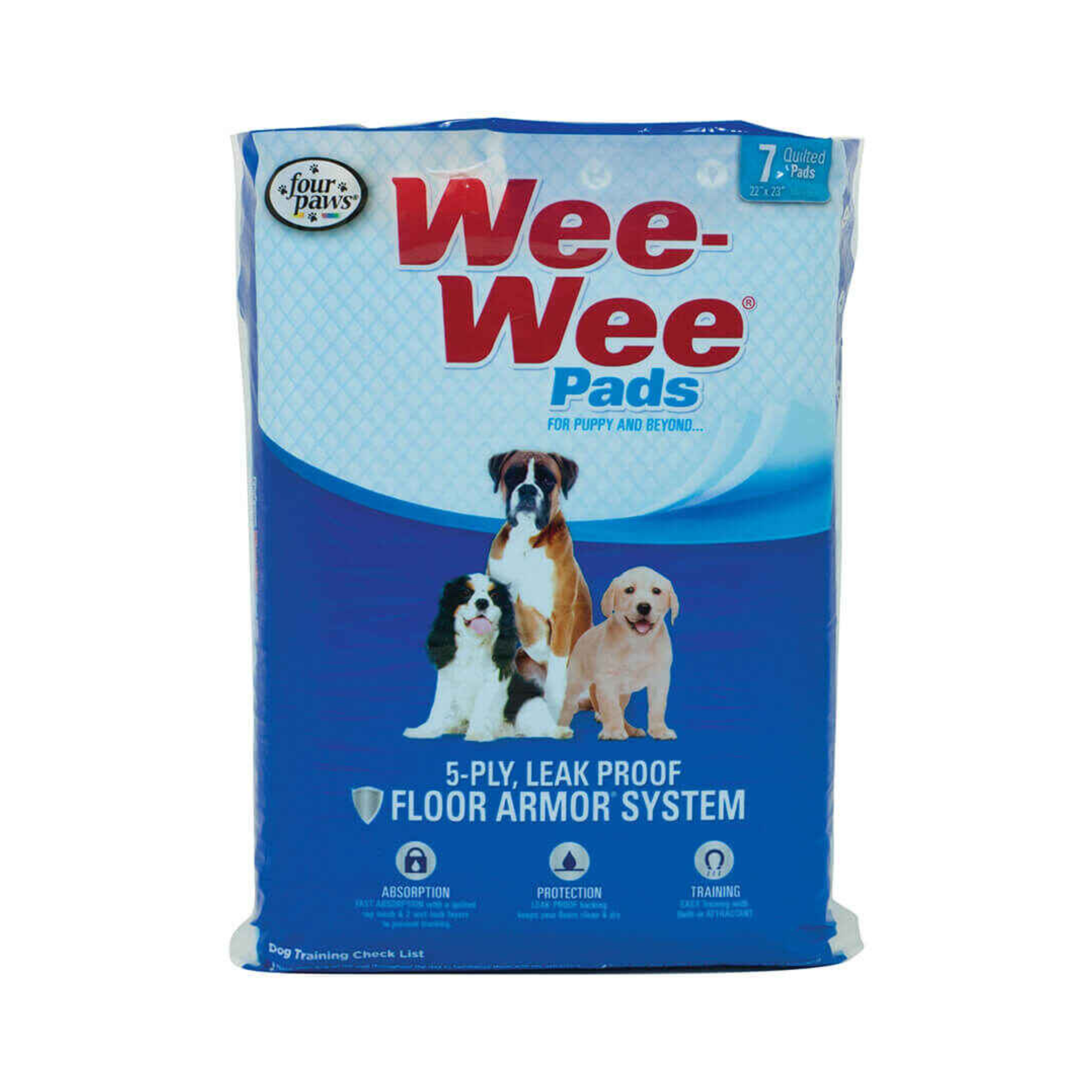 Wee-Wee Superior Performance X-Large Dog Pee Pads are 80% larger and more absorbent compared to 5-layer Wee-Wee Pads. Designed with a 6-layer Floor Armor Leak-Proof System, these Wee-Wee Pads trap in wetness with a quilted top layer, feature 2 moisture-locking layers for maximum absorption, and include a leak-proof backing to keep floors dry. All Wee-Wee Pads also include targeted attractant to draw your dog to the pad and prevent potty training accidents elsewhere. These extra large dog training pads are the perfect potty solution for dogs of all sizes, including large dogs