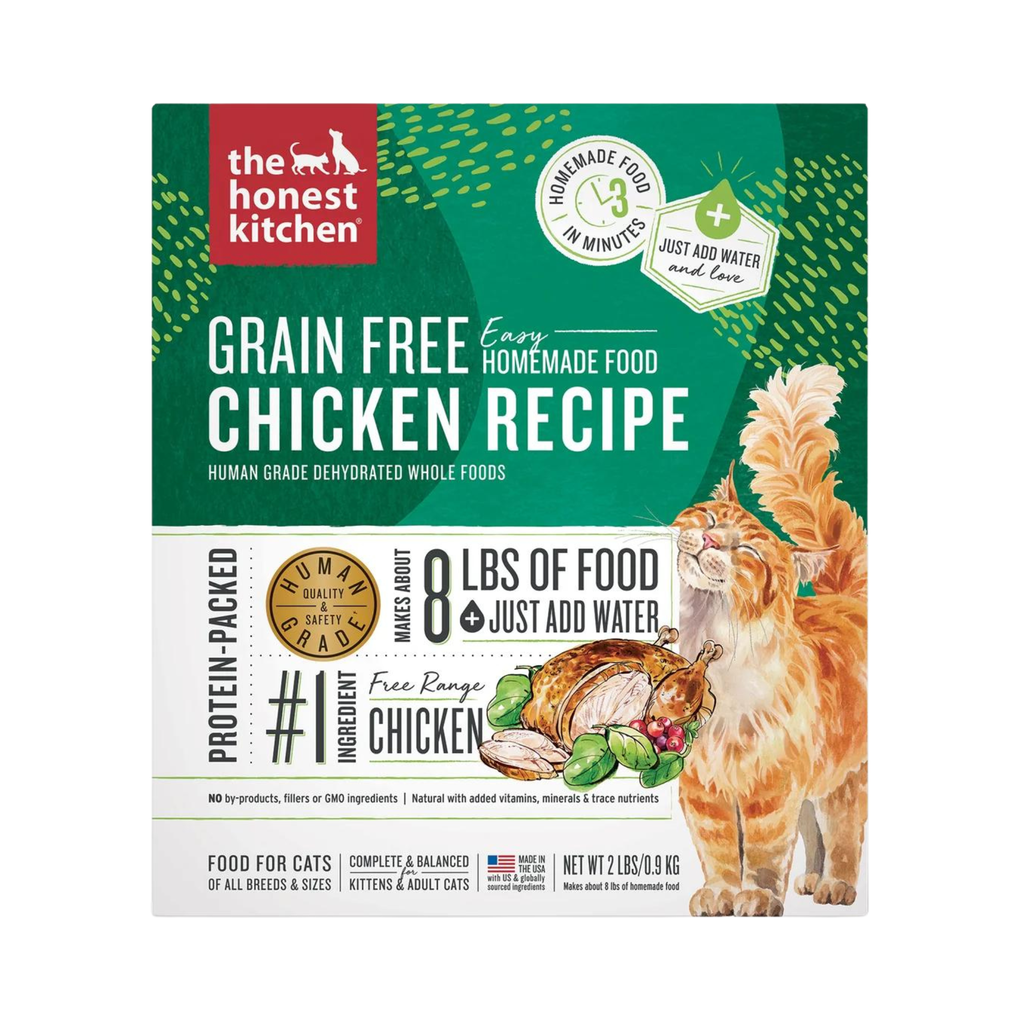 Crafted with a vet nutritionist, this 100% human grade grain free dehydrated cat food recipe is packed with tasty free range chicken, boosted with probiotics to support digestion, and finished with a splash of nutritious bone broth to add extra flavor and boost protein. To meet our human grade standard, we use the same whole foods you’d recognize in your own kitchen, and make this recipe in a human food facility. Simply add water to this healthy-yet-tasty recipe for a protein-packed, moisture-rich meal your cat will love.