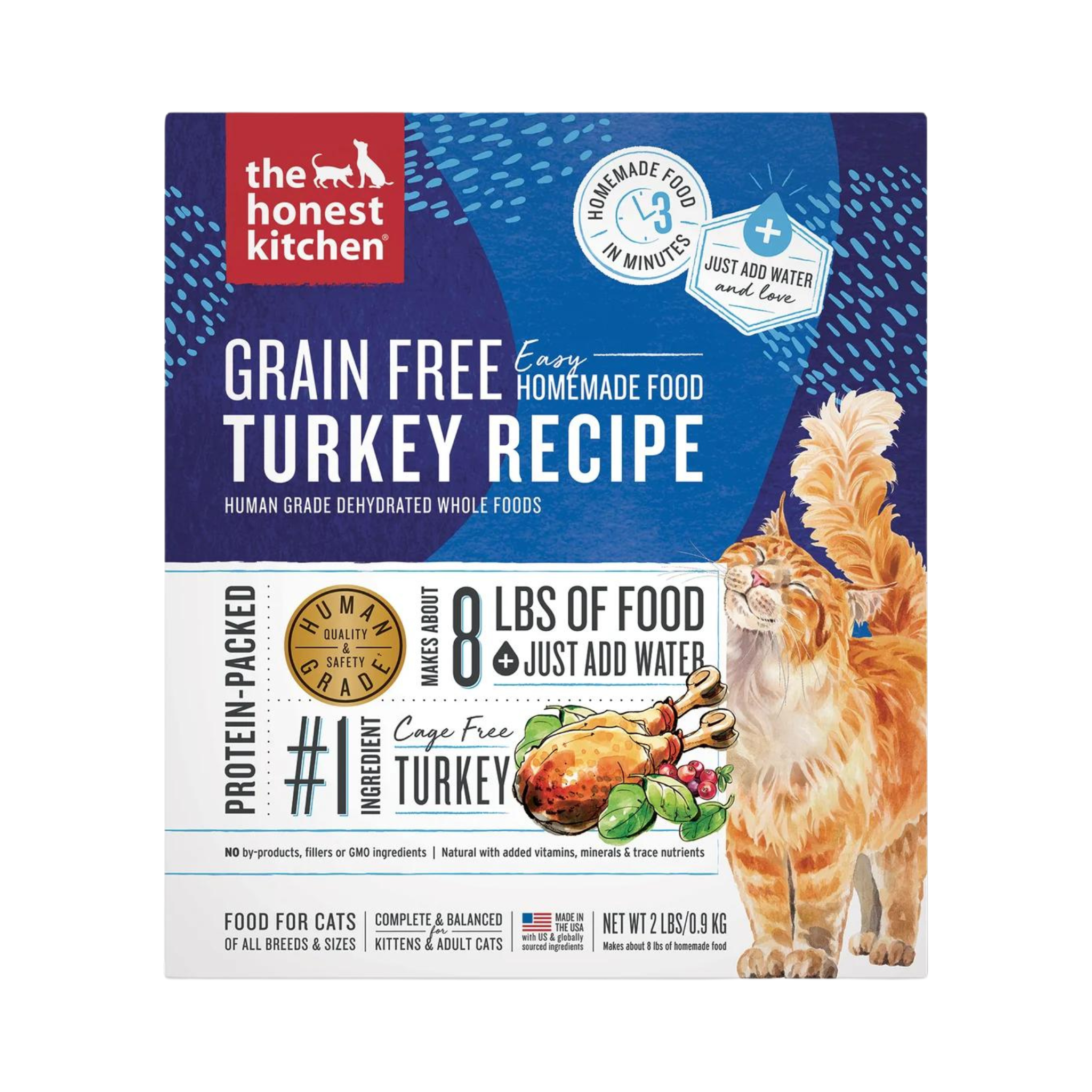 Crafted with a vet nutritionist, this 100% human grade grain free dehydrated cat food recipe is packed with tasty cage free turkey, boosted with probiotics to support digestion, and finished with a splash of nutritious bone broth to add extra flavor and boost protein. To meet our human grade standard, we use the same whole foods you’d recognize in your own kitchen, and make this recipe in a human food facility. Simply add water to this healthy-yet-tasty recipe for a protein-packed, moisture-rich meal your cat will love.